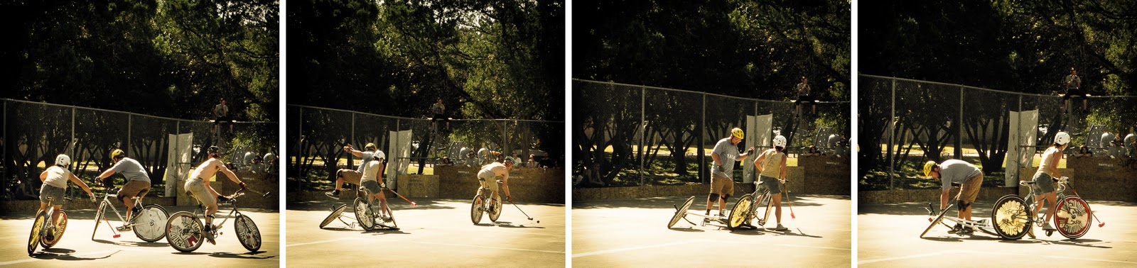 Here's an interesting photo-sequence (click to see bigger), taken by Darcie with my camera, which features yours truly turning too sharply and foot-downing, followed by my wheel getting run over by an opposing team member. Polo is a rather civilized game, so the other team member apologized for running over my wheel and I said it wasn't a problem and we both rode off and tapped in.